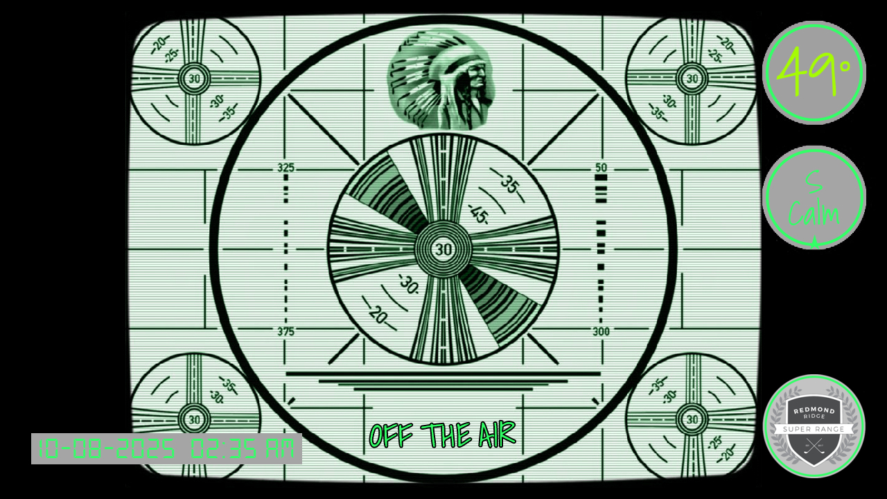 - - - GC @ Redmond Ridge - 11th Green Weather - - - Updated: 10/08/2025 12:45 AM TEMP: 50.4°F DEW-POINT: 47.5°F MIN-TEMP: 49.8°F @ 00:30 MAX-TEMP: 51.6°F @ 00:05 BAROMETER: 29.85 INHG STEADY HUMIDITY: 90% WIND: CALM FROM THE ESE GUSTING: 0.0 MPH HIGH-GUST: 1.1 MPH @ 00:15 SOLAR-RADIATION: 0.00 WM^2 UV-INDEX: 0-NO RISK PRECIP-RATE: 0.00 IN/HR DAILY-PRECIP: 0.00 IN WEEKLY-PRECIP: 0.00 IN MONTHLY-PRECIP: 0.60 IN SUNRISE: 07:15 PDT SUNSET: 18:36 PDT
